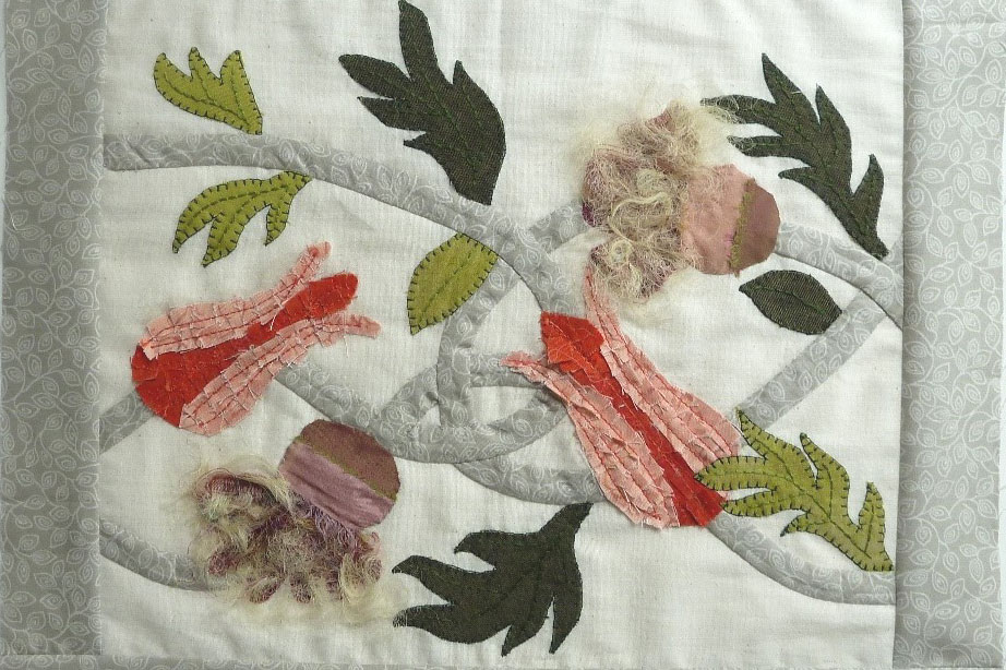 ‘I would never consider myself to be a creative person. At school I was advised to give up Art at 14. Although I have taken adult education courses over the years, from cake decorating and bread making to batik and bridge, it is my sister in New Zealand who has been considered the ‘arty one’. Over the years I have admired her beautiful patchwork quilts and wall hangings. Five years ago she shipped me back home with a cutting mat and rotary cutter – not the easiest things to fit into a suitcase. The Patchwork Basket in Newent near Gloucester was my starting point and a year-long sampler quilt course provided a sound base of patchwork skills. I followed this with a medallion quilt, a couple of jelly roll quilts, attended appliqué workshops and gained wonderful support and friendship from my fellow quilters.